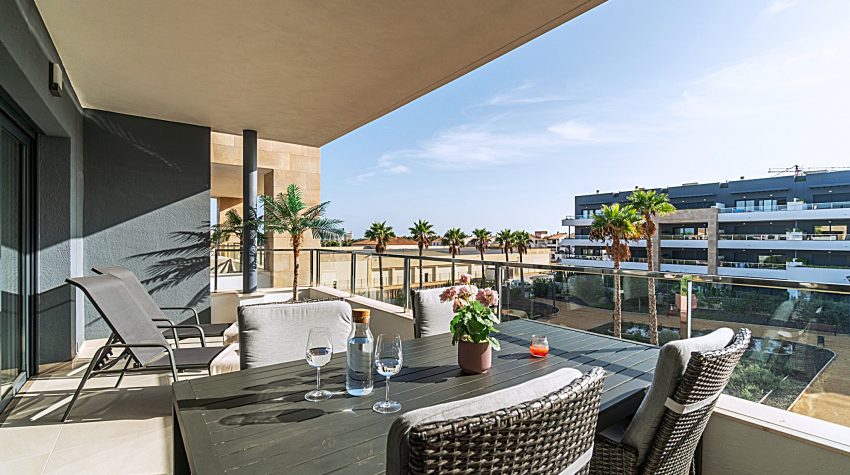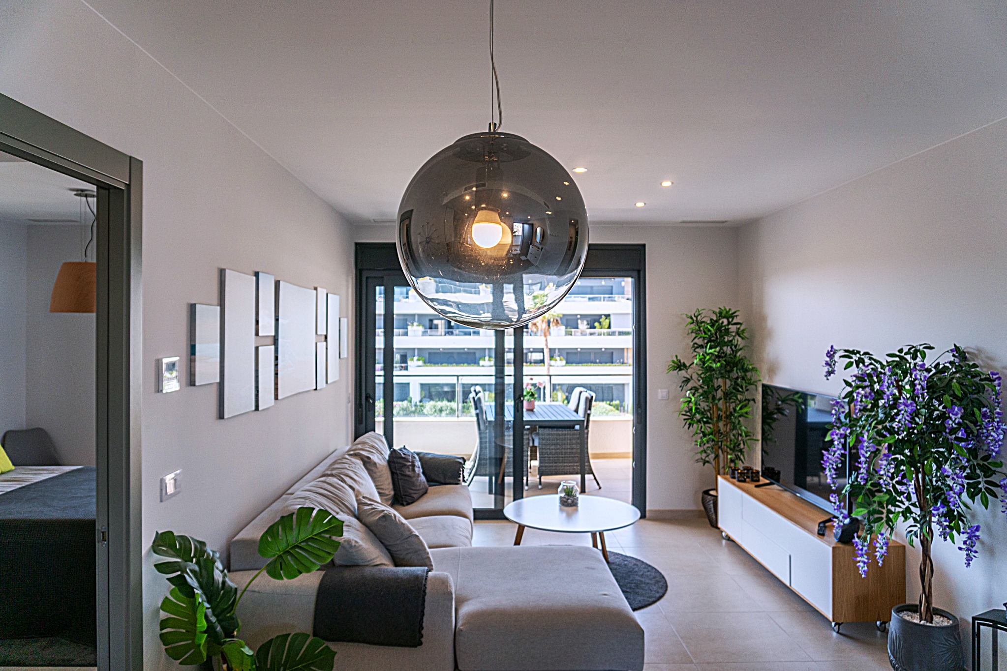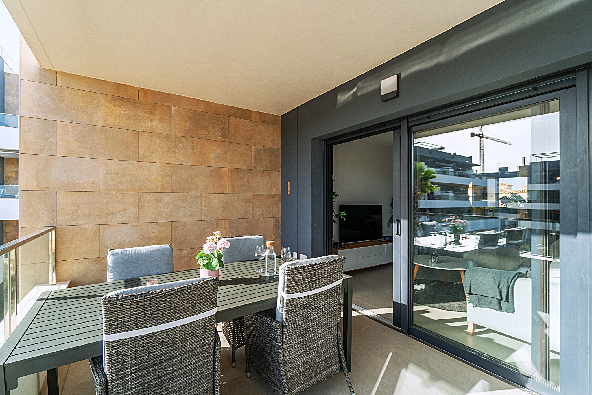 ¡Con gran alegría podemos presentar este lujoso y moderno apartamento en la fase 1 del popular complejo Flamenca Village! El apartamento tiene orientación suroeste y consta de dos dormitorios, dos baños, salón-comedor, cocina con lavadero, trastero y una gran terraza. Al entrar en el apartamento, encontrarás la cocina a tu izquierda. Junto a la cocina encontrarás el lavadero. Frente a la cocina abierta, tienes el comedor y un salón de buen tamaño. El salón tiene dos grandes puertas correderas que dan a la terraza y dejan entrar mucha luz natural. A la derecha del comedor hay un baño moderno y un dormitorio. Ambas habitaciones tienen un aire muy moderno y están impresionantemente amuebladas, igual que el resto del apartamento. A la izquierda de la zona de comedor tienes el dormitorio principal, con cuarto de baño ensuite y un trastero. El dormitorio principal también tiene ventanas correderas con acceso a la terraza. La terraza está orientada al suroeste y tiene vistas a una acogedora zona de parque y hasta el mar. La vivienda se vende totalmente amueblada y equipada con todo lo que puedas necesitar. También es un apartamento con un gran potencial de alquiler y ya tiene concedida la licencia turística. Está equipado con aire acondicionado, calefacción por suelo radiante en los baños, sistema de filtración de agua y wifi. También incluye una plaza de aparcamiento en el sótano.